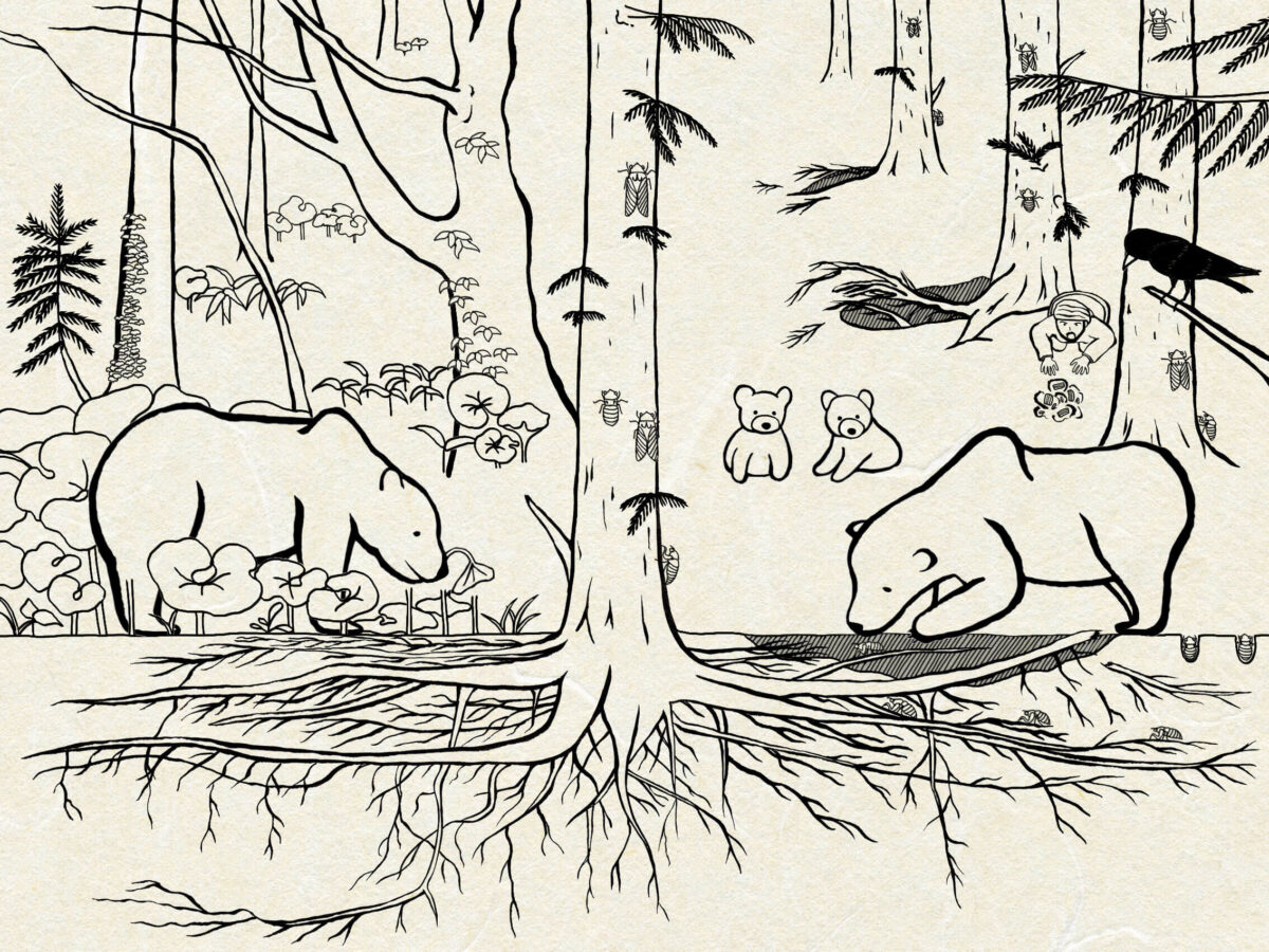 ヒグマが地中のセミを掘り返すことによる生態系への影響を調べた研究。違いがわかり易いようにイラストを左右中央で分けました。左がヒグマによるセミの掘り返しの無い、自然状態の森林。右が掘り返しの有った造林地。根が剥き出しになったり、地表の植生が変わったりしています。また、母グマの行動を見て子グマやカラスが学習しています。